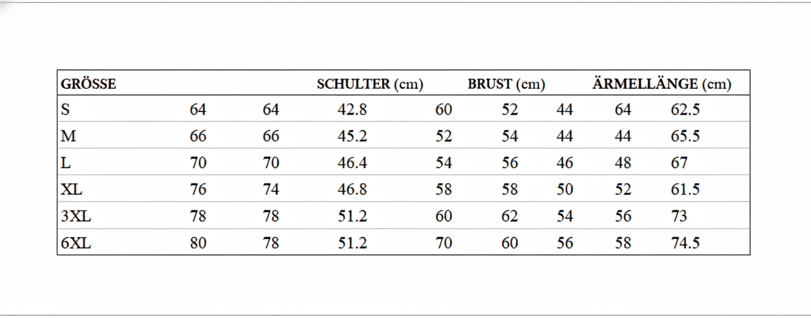 Alle Angaben sind Richtwerte und können leicht variieren. Wir empfehlen, die Maße sorgfältig zu überprüfen und mit den eigenen Körpermaßen zu vergleichen, um die perfekte Passform zu finden. Sollten Sie Fragen zu den Größen haben, kontaktieren Sie gerne unseren Kundenservice.
